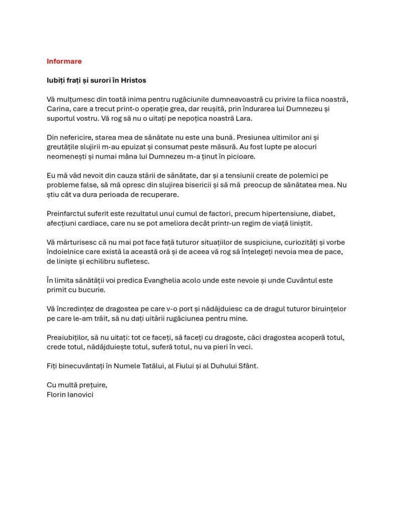 Informarelubiți frați și surori în HristosVă mulțumesc din toată inima pentru rugăciunile dumneavoastră cu privire la fiica noastră, Carina, care …